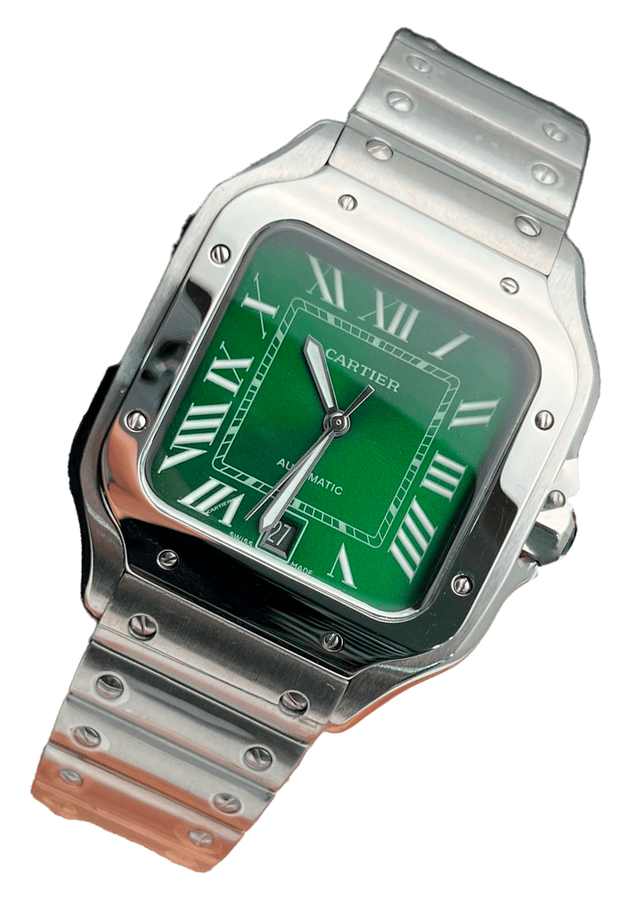 El Cartier Santos Automático 38mm con esfera verde ofrece una elegante combinación de diseño clásico y moderno, con una caja de acero inoxidable y números romanos, ideal para quienes buscan un estilo sofisticado y único.